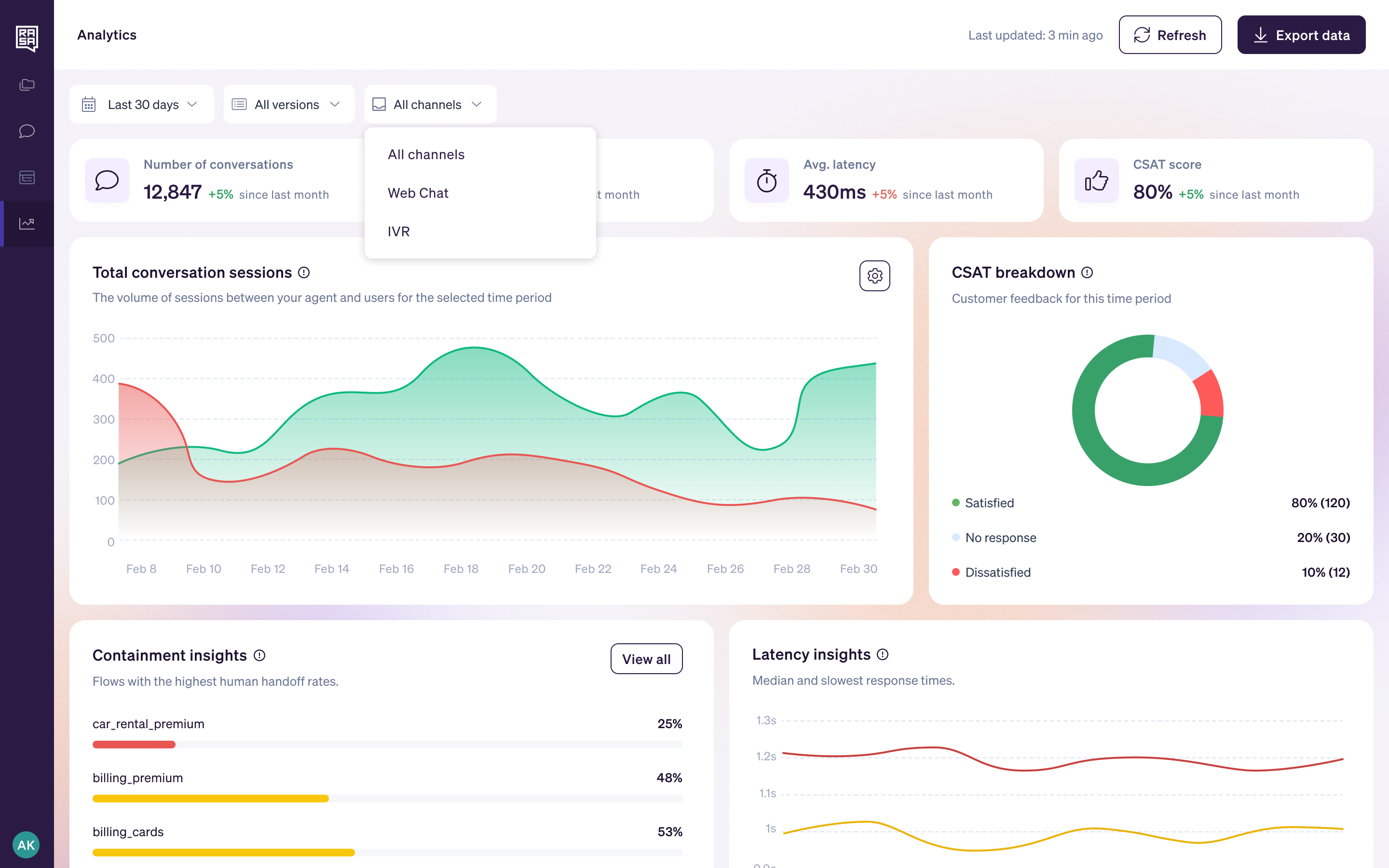Conversation-level containment tracking, CSAT correlation, resolution quality scoring, and full audit trails for every AI-generated response.