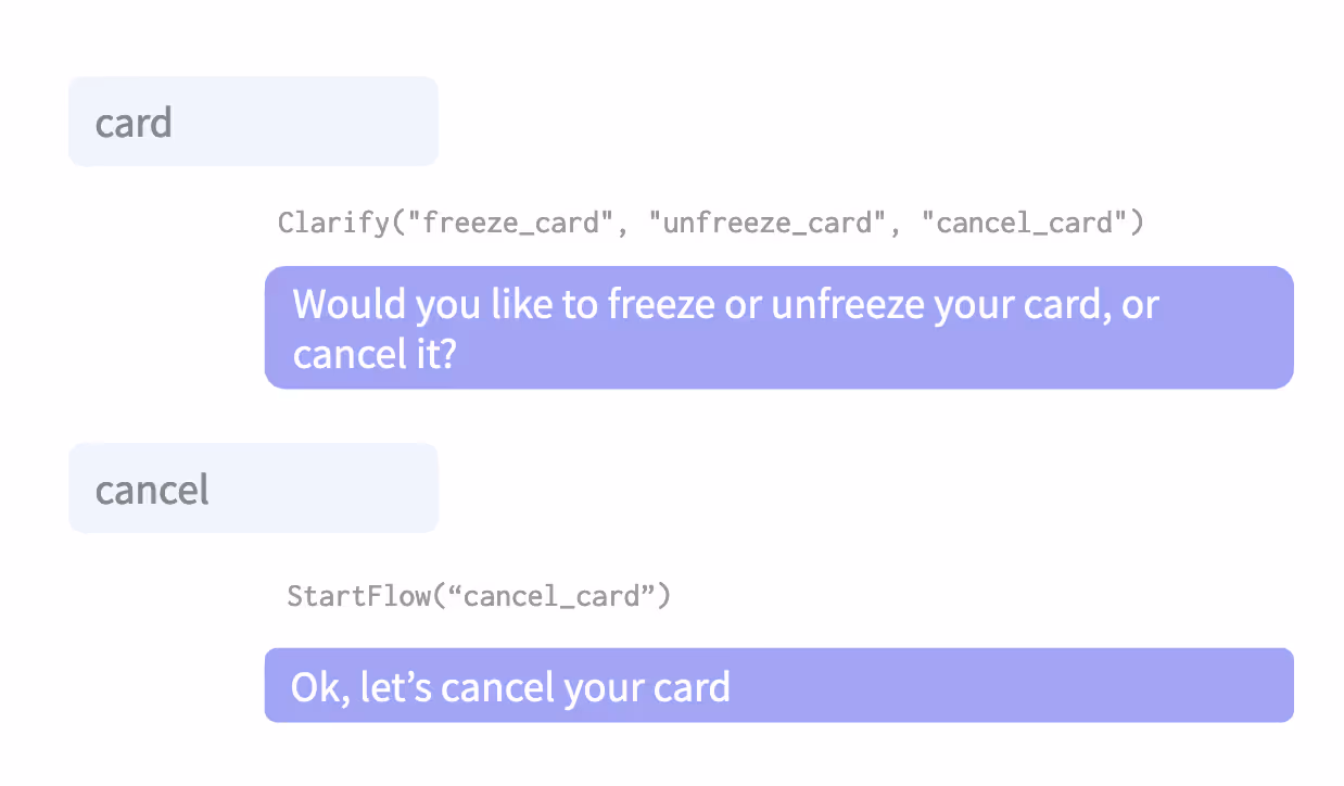 You can build a simple flow like the money transfer example above, and your assistant will automatically handle conversations where users change their mind, interject mid flow, switch context, or ask clarifying questions.