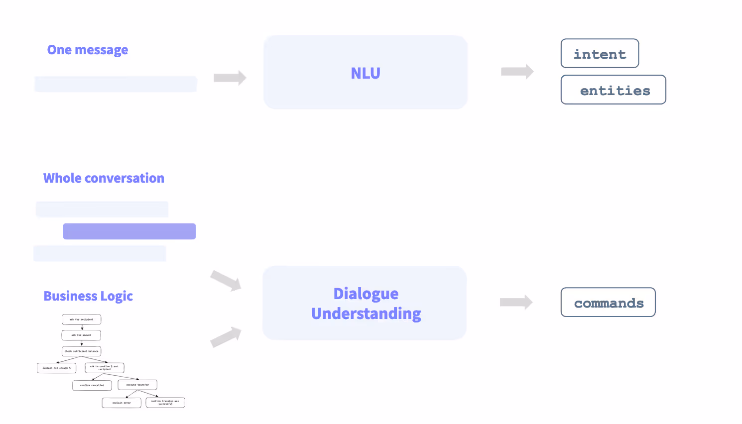 - While NLU interprets one message in isolation, DU considers the greater context: the whole back-and-forth of the conversation as well as the assistantâs business logic.