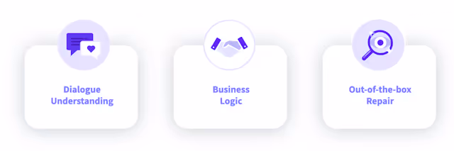 Dialogue Understanding translates what users say into what that means for your business logic. But real user behavior is more complex than just following the happy path. When your assistant asks a user for some information, conversation repair kicks in if the user does something other than providing the information you requested. CALM handles these out-of-the-box using fully customizable patterns.