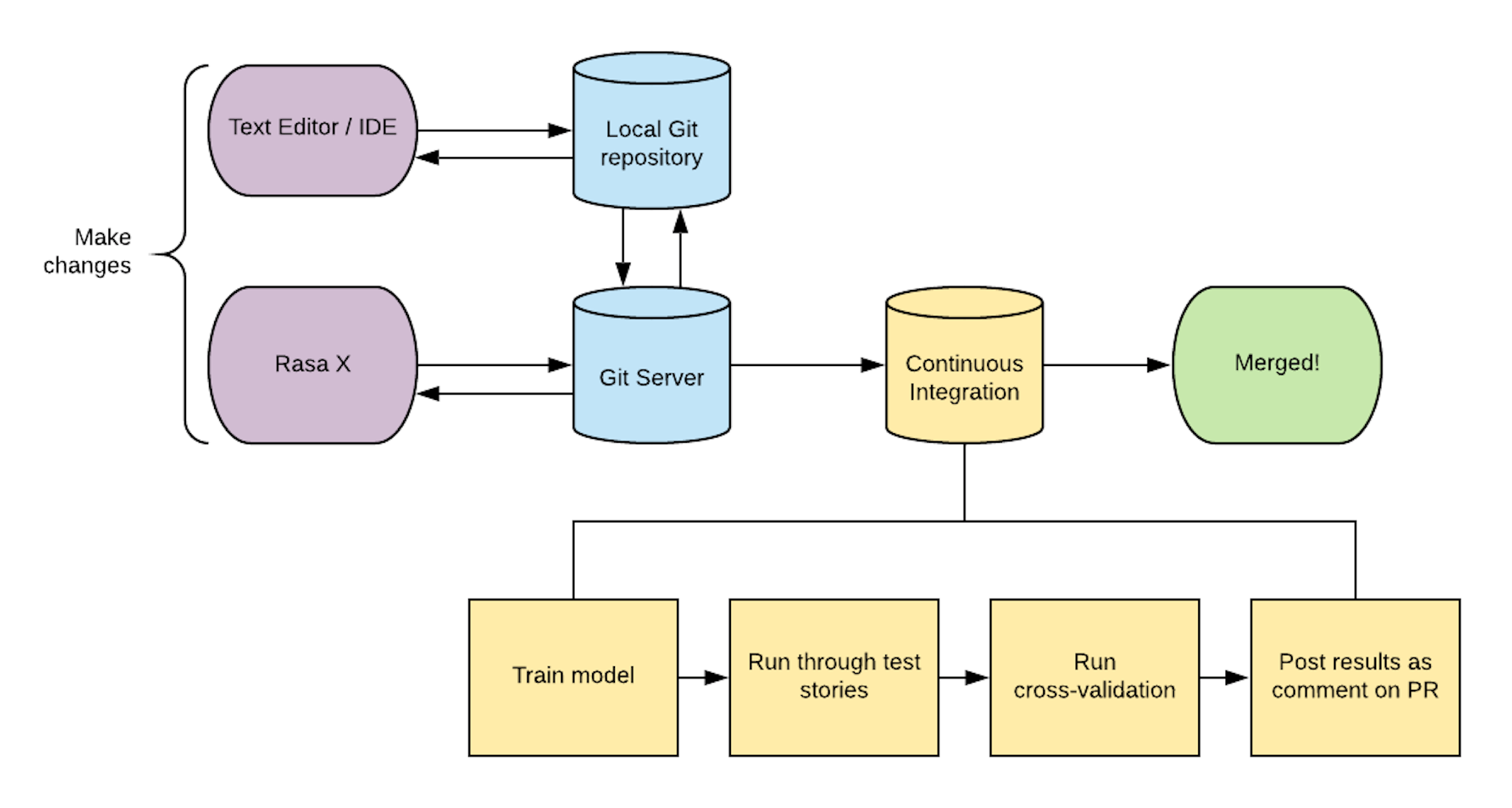 Version control in Rasa X is built on top of Git. This means that developers can use any of the git-based tools they know and love to automate their workflow. Jenkins, GitHub Actions, Travis CI, Kubernetes, Helm, you name it!