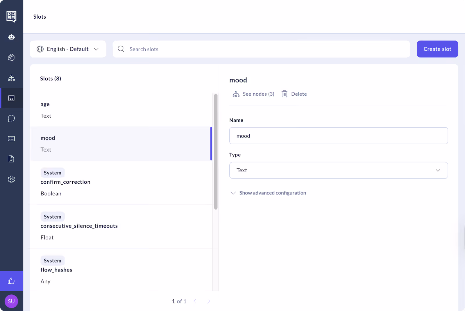 Slots now have their own slots CMS section accessible from the navigation menu. Content managers can create, edit, and delete slots. The "See nodes" button shows exactly where each slot is referenced across your flows, which eliminates the guesswork when you need to understand slot usage or safely deprecate old slots. There is also a corresponding button and link CMS for content managers.