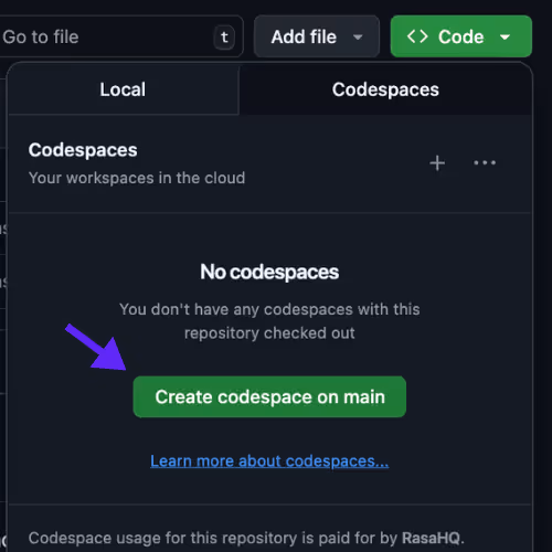 We’ll be using Codespaces and initiate Rasa from a pre-defined tutorial template.