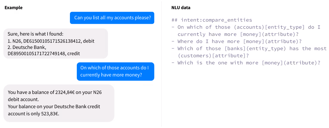 A lot of the above questions require domain knowledge to be correctly answered. Users want to not only ask questions about a certain entity, they also want to compare entities, or get information about entities mentioned earlier in the conversation. Hard-coding the information would not help. Recent transactions changequickly, and up-to-date information is important. Additionally, your bot should be able to resolve references to previously mentioned entities like "that account" or "the first one," so entities need to be recognised and reused at a later point in the conversation.