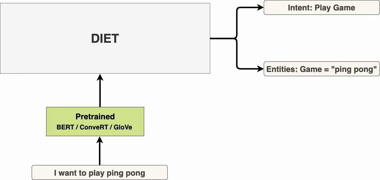 DIET is a multi-task transformer architecture that handles both intent classification and entity recognition together. It provides the ability to plug and play various pre-trained embeddings like BERT, GloVe, ConveRT, and so on. In our experiments, there isn't a single set of embeddings that is consistently best across different datasets. A modular architecture, therefore, is especially important.